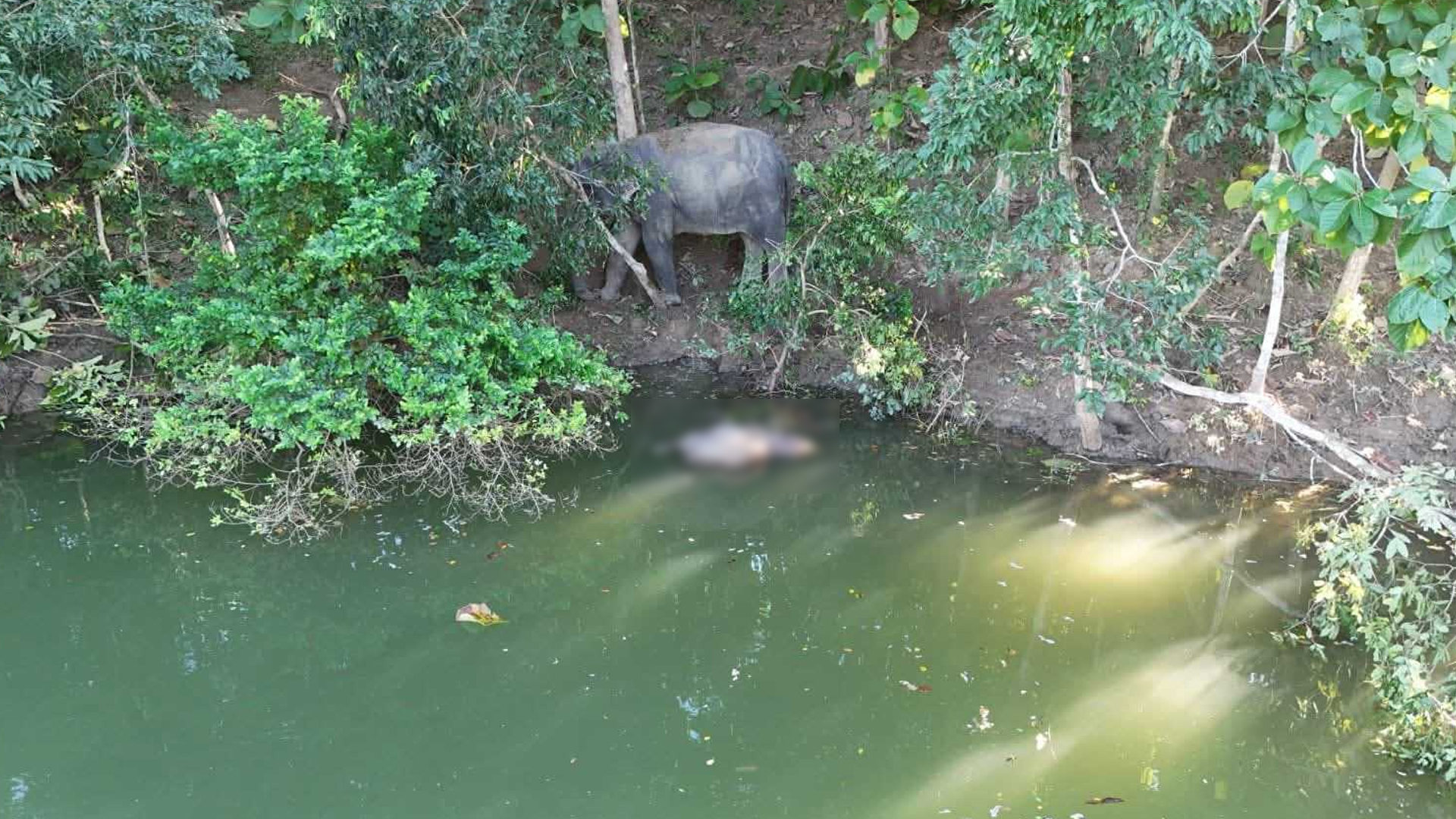 হ্রদে ভাসছে বিরল রঙের হাতি শাবকের মরদেহ। ছবি:ওয়ার্ল্ড ক্রাইম নিউজ ২৪.কম