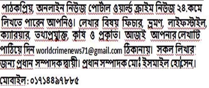 প্রতিটি উপজেলায় সংবাদদাতা আবশ্যক। যোগাযোগ ০১৭১৪৪৯৭৮৮৫