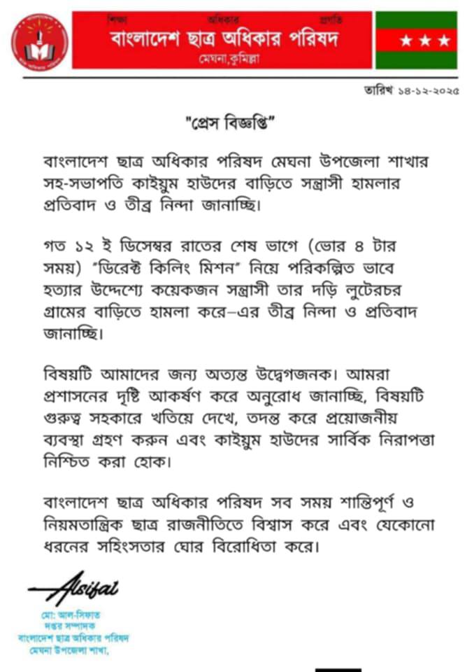 কুমিল্লা মেঘনা উপজেলা ছাত্র অধিকার পরিষদের সিনিয়র সহ-সভাপতি কাইউম কে হত্যার উদ্দেশ্যে গভীর রাতে দুর্বৃত্তরা দেশীয় অস্ত্র নিয়ে মহড়া মেঘনা উপজেলা ছাত্র অধিকার পরিষদের সিনিয়র সহ-সভাপতি কাইউম কে তার নিজ বাড়িতে বাড়িতে হত্যার উদ্দেশ্যে গভীর রাতে দুর্বৃত্তরা দেশীয় অস্ত্র নিয়ে মহড়া দেয়! এই সময় তাকে না পেয়ে তার বোনকে বলে তোর ভাই আজকে বেঁচে গেছে, এমতাবস্থায় সে এবং তার পরিবার নিরাপত্তাহীনতায় ভুগছেন, মেঘনা প্রশাসনের সুদৃষ্টি কামনা করছি! অবিলম্বে ঘটনার সুষ্ঠু তদন্ত ও বিচাররে দাবি করছি!
