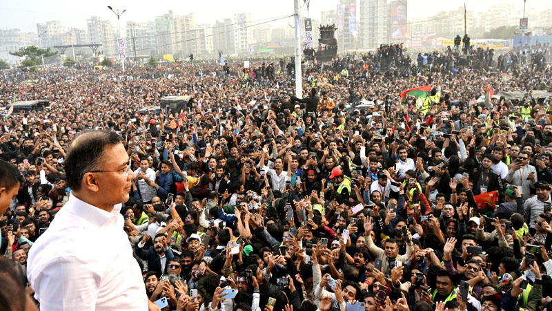 গণসংবর্ধনা মঞ্চে তারেক রহমান। ছবি: সংগৃহীত