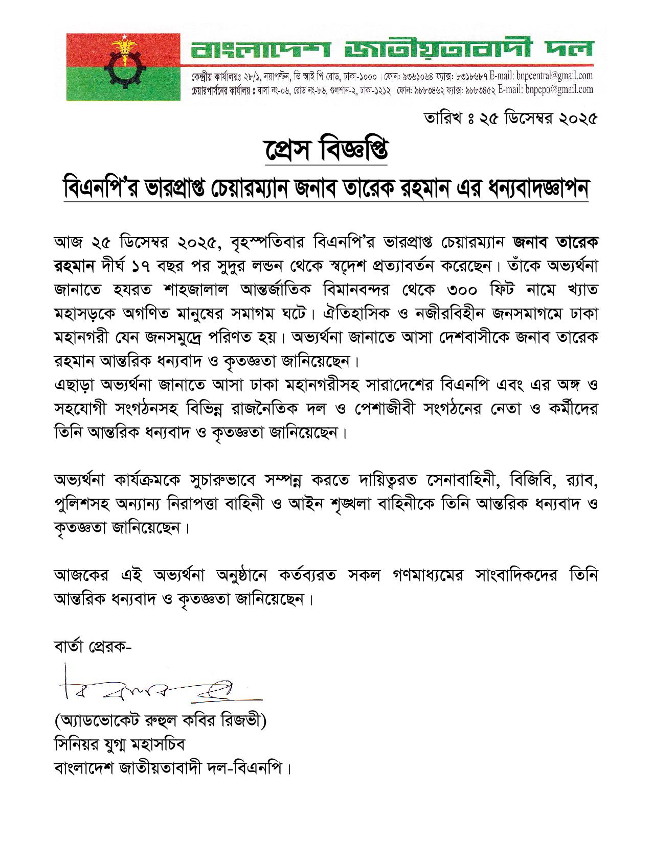 সেখানে বলা হয়, বিএনপির ভারপ্রাপ্ত চেয়ারম্যান তারেক রহমান দীর্ঘ ১৭ বছর পর সুদূর লন্ডন থেকে স্বদেশ প্রত্যাবর্তন করেছেন। তাকে অভ্যর্থনা জানাতে হযরত শাহজালাল আন্তর্জাতিক বিমানবন্দর থেকে জুলাই ৩৬ একপ্রেসওয়ে সংলগ্ন এলাকায় অগণিত মানুষের সমাগম ঘটে। ঐতিহাসিক ও নজিরবিহীন জনসমাগমে ঢাকা মহানগরী যেন জনসমুদ্রে পরিণত হয়। অভ্যর্থনা জানাতে আসা দেশবাসীকে তারেক রহমান আন্তরিক ধন্যবাদ ও কৃতজ্ঞতা জানিয়েছেন।