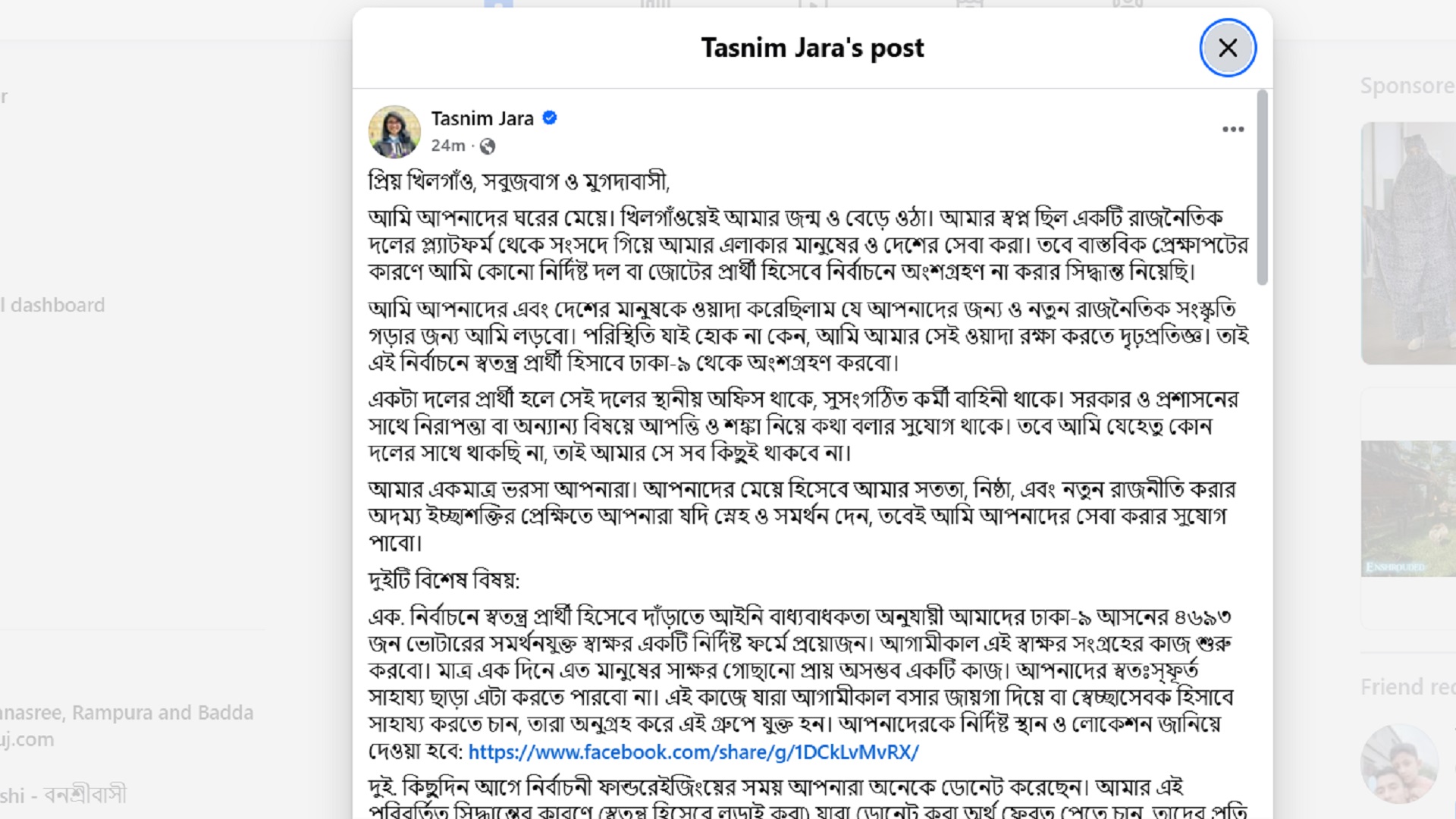 ফেসবুক পোস্টে তিনি লেখেন, প্রিয় খিলগাঁও, সবুজবাগ ও মুগদাবাসী, আমি আপনাদের ঘরের মেয়ে। খিলগাঁওয়েই আমার জন্ম ও বেড়ে ওঠা। আমার স্বপ্ন ছিল একটি রাজনৈতিক দলের প্ল্যাটফর্ম থেকে সংসদে গিয়ে আমার এলাকার মানুষের ও দেশের সেবা করা। তবে বাস্তবিক প্রেক্ষাপটের কারণে আমি কোনো নির্দিষ্ট দল বা জোটের প্রার্থী হিসেবে নির্বাচনে অংশগ্রহণ না করার সিদ্ধান্ত নিয়েছি।