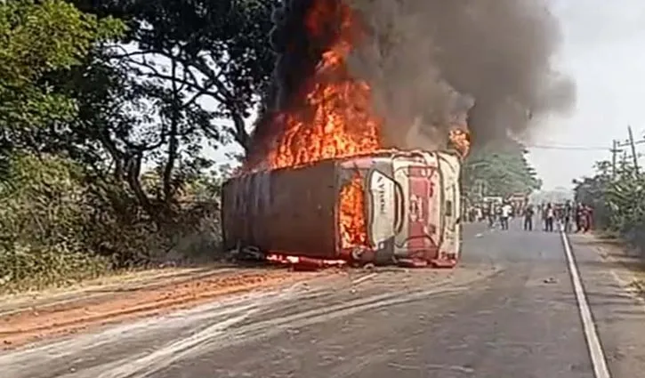 কুমিল্লার দাউদকান্দি উপজেলার বানিয়াপাড়া এলাকায় দুর্ঘটনার পর বাসটিতে আগুন ধরে যায়।