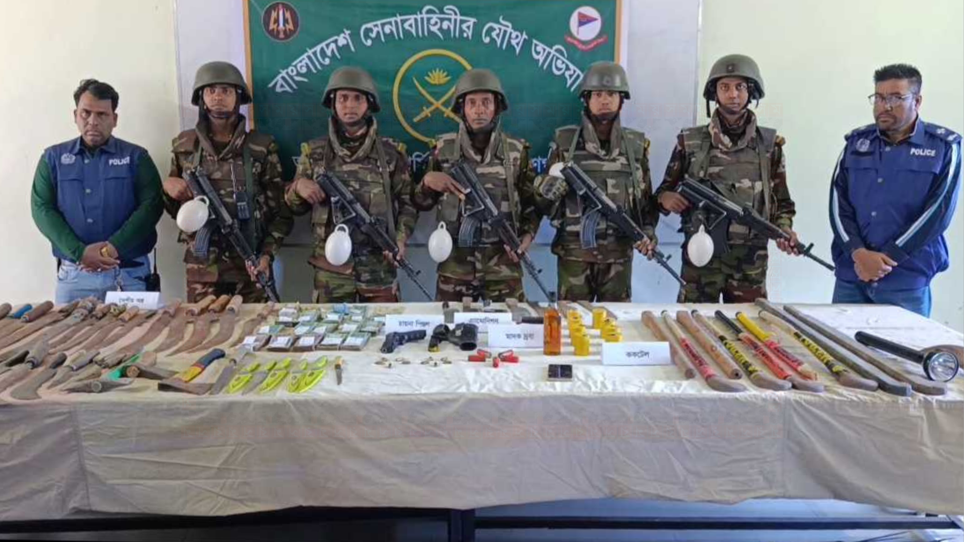 এছাড়া ২৮৮টি বল্লম, ছোট-বড় ২০টি ছুরি, ৭টি চাপাতি, ১৫টি রামদা, ৬টি দা, ১২টি চাকু, ৩টি বটি, ৩টি চায়নিজ কুড়াল, ৬টি হকিস্টিক, টেঁটা, লাঠিসোঁটা, ইলেকট্রিক শক দেয়ার মেশিনসহ বিপুল সংখ্যক দেশীয় অস্ত্র, মোবাইল ফোন, বড় টর্চলাইট, মদ এবং নগদ ১০ লক্ষাধিক টাকাও অভিযানে উদ্ধার হয়। এসব অবৈধ অস্ত্র জব্দসহ ঘটনাস্থল থেকে স্বপন, জাকির, জনি, মতিন ও রিংকু মিয়া নামে পাঁচজন দুষ্কৃতকারীকে আটক করে যৌথ বাহিনী।