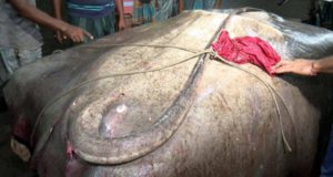 (ভিডিও)তরমুজের ক্ষেতে সাড়ে ১৪ মণের শাপলা পাতা মাছ