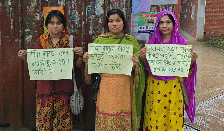 মঙ্গলবার সরেজমিনে দেখা যায়, ফজিলতুন্নেসা হলের সামনে প্ল্যাকার্ড হাতে দাঁড়িয়ে আছে ওই তিন কর্মচারী। একজনের প্ল্যাকার্ডে লেখা- ‘বিনা কারণে চাকরিচ্যুত হওয়া মানি না’, ‘আমরা হারানো চাকরি ফেরত চাই’, ‘আমরা হলে কাজ করতে এসেছি, প্রাধ্যক্ষ নজরুল স্যারের বাসায় কাজ করতে নয়।’