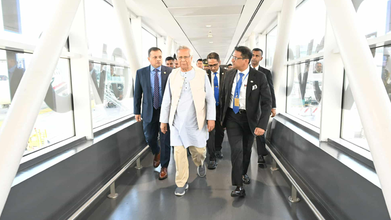 এর আগে রোববার বেলা সাড়ে ১১টার দিকে প্রধান উপদেষ্টা ও তার সফরসঙ্গীদের নিয়ে বিমান বাংলাদেশ এয়ারলাইন্সের একটি ফ্লাইট হযরত শাহজালাল আন্তর্জাতিক বিমানবন্দর ত্যাগ করে।