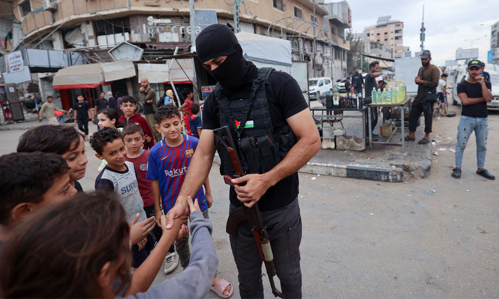 ১২ অক্টোবর গাজা উপত্যকার নুসাইরাত শরণার্থী শিবিরে ফিলিস্তিনি গোষ্ঠী হামাসের অভ্যন্তরীণ নিরাপত্তা বাহিনীর একজন সদস্য পথচারীদের অভ্যর্থনা জানাচ্ছেন। ছবি : এএফপি