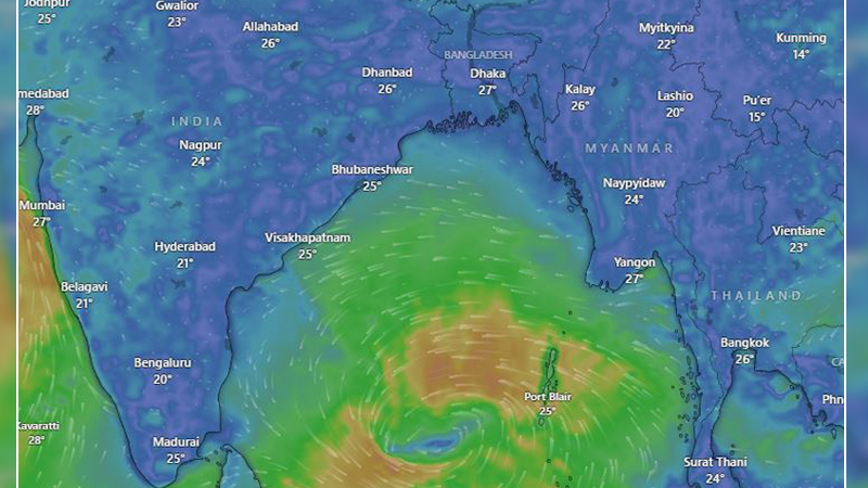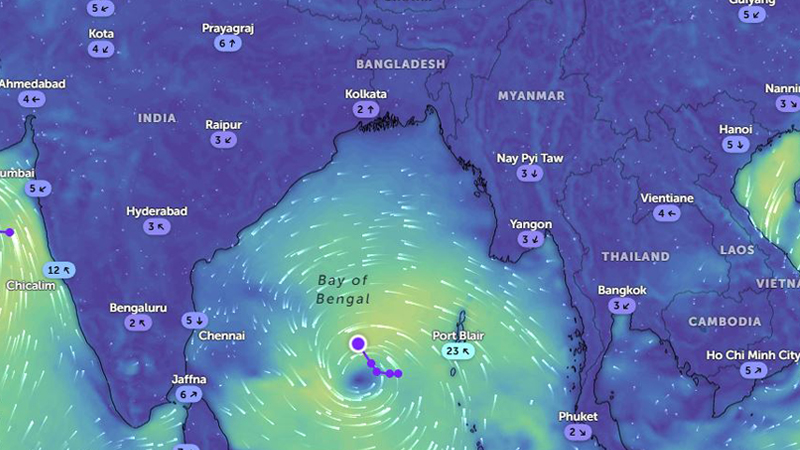 এদিকে ভারতের আবহাওয়া অধিদপ্তরের তথ্য অনুযায়ী, দক্ষিণ-পূর্ব বঙ্গোপসাগরে অবস্থানরত নিম্নচাপটি শনিবার দুপুর নাগাদ ১০.৮° উত্তর অক্ষাংশ এবং ৮৮.৬ পূর্ব দ্রাঘিমাংশের কাছাকাছি অবস্থান করছিল। এই সময়ে নিম্নচাপটি পোর্ট ব্লেয়ার (আন্দামান ও নিকোবর দ্বীপপুঞ্জ) থেকে প্রায় ৪৬০ কিলোমিটার পশ্চিম-দক্ষিণ-পশ্চিমে, চেন্নাই (তামিলনাড়ু) থেকে ৯৫০ কিলোমিটার পূর্ব-দক্ষিণপূর্বে, বিশাখাপত্তনম (অন্ধ্রপ্রদেশ) থেকে ৯৬০ কিলোমিটার দক্ষিণ-পূর্বে, কাকিনাড়া (অন্ধ্রপ্রদেশ) থেকে ৯৭০ কিলোমিটার দক্ষিণ-পূর্বে এবং গোপালপুর (ওড়িশা) থেকে ১০৩০ কিলোমিটার দক্ষিণ-পূর্বে অবস্থান করছিল।