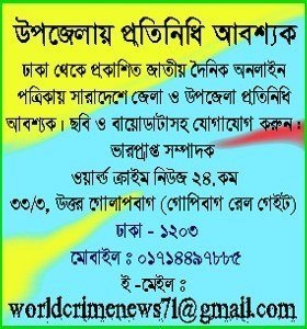 আপনি অপরাধমূলক সংবাদ পাঠাতে পারেন লিখা ও ভিডিও এবং চিত্রসহ প্রধান সম্পাদক মোঃ ইসমাইল হোসেন দ্বায়ী থাকবেন। আপনার নাম ও ঠিকানা এবং মোবাইল নাম্বার গোপন থাকবে। লিখুন আমার ফেইজ বুকে Md Ismail Hossain অথবা ওয়ার্ল্ড ক্রাইম নিউজ ২৪.কম।মোবাইল: ০১৭১৪৪৯৭৮৮৫